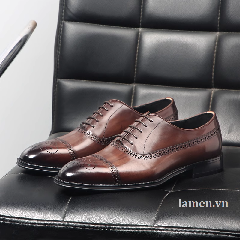 Giày Tây Nam Công Sở Oxford Half Brogue - Da ngoài (upper): da bò - Lót ngoài (uperlining): da dê - Lót trong (sock lining): da dê - Đế (outsole): cao su. - Màu sắc: được đánh sơn bằng tay. - Handmade 100% * Thiết kế buộc dây trẻ trung, sang trọng và lịch lãm dễ dàng phối với tây, Vest, suit và Kaki.